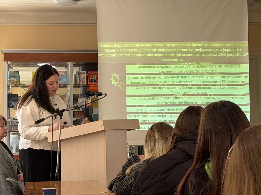 Юлія Руденко представила доповідь на тему «Цифрова трансформація фінансової системи як чинник оптимізації ринкових процесів». Розкрила ключові аспекти впливу цифровізації на сучасну фінансову систему, зокрема автоматизацію фінансових операцій, впровадження інноваційних технологій у банківському секторі та підвищення ефективності ринкових механізмів. Окрему увагу було приділено ролі цифрових інструментів у забезпеченні прозорості фінансових потоків та оптимізації управлінських рішень. Виступ супроводжувався жвавою науковою дискусією, у ході якої учасники обговорили перспективи подальшого розвитку цифрової економіки та її вплив на стабільність і конкурентоспроможність фінансового ринку України.