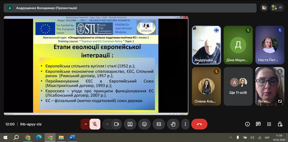 14.02.2026 року в Державному податковому Університеті розпочато факультативний курс третього року виконання: «Оподаткування та спільна податкова політика ЄС» в рамках здійснення Модуля Жана Моне «Формування стійкого інтересу до податкової культури ЄС шляхом запровадження освітніх, наукових та комунікативних просвітницьких заходів, орієнтованих на українське суспільство» (Грантова Угода № 101125984 – TIEU).