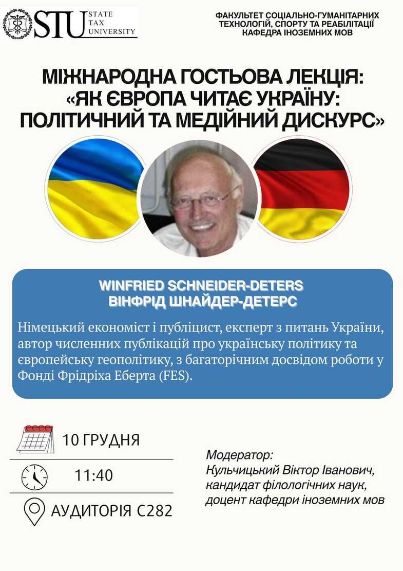 На запрошення кафедри іноземних мов факультету соціально-гуманітарних технологій, спорту та реабілітації Державний податковий університет відвідав німецький економіст і публіцист, експерт з питань України, автор численних публікацій про українську політику та європейську геополітику, з багаторічним досвідом роботи у Фонді Фрідріха Еберта (FES). Winfried Schneider-Deters Вінфрід Шнайдер-Детерс.
