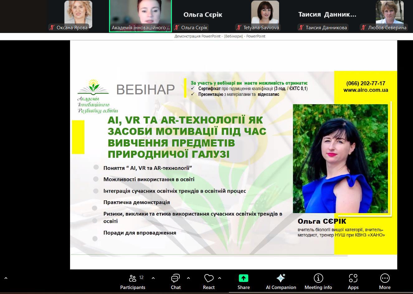 Вебінар: «AI, VR та AR-технології як засоби мотивації під час вивчення предметів природничої галузі»