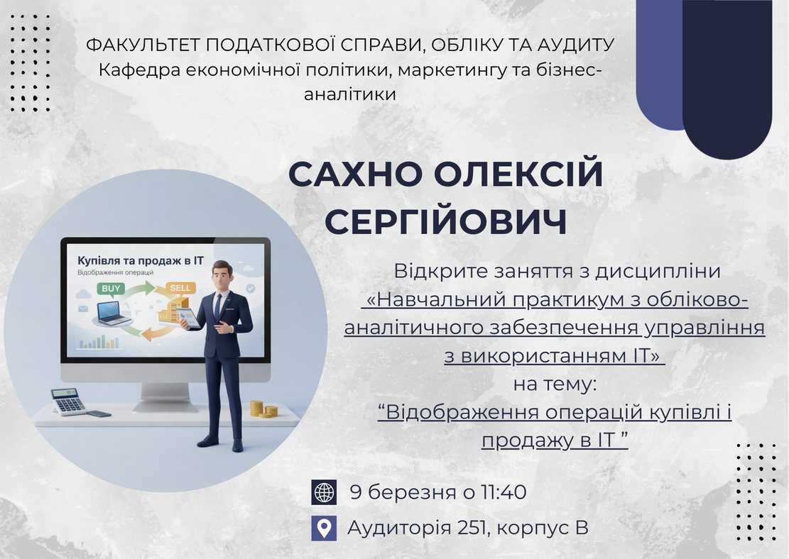 9.03.2026 об 11.40 (3 пара) ауд. В251 Сахно Олексій Сергійович старший викладач кафедри економічної політики, маркетингу та бізнес-аналітики проводить відкрите заняття з навчальної дисципліни «Навчаль...