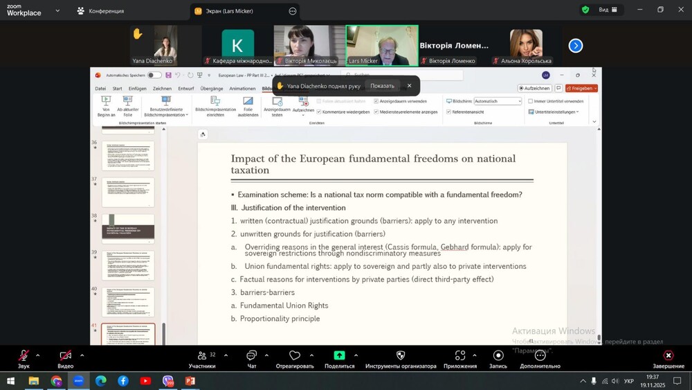 Students of the Educational and Scientific Institute of Law of the State Tax University attended a lecture course titled “European Law: European Tax Law,” organised by the initiative of the Department of International Cooperation of STU. The guest lecturer was Dr Lars Miker, Professor and Director of the Institute of International Tax Law in Nordkirchen, Germany. The meetings were moderated by the Head of the Department of Legal Linguistics and Doctor of Juridical Sciences, Viktoriia Mykolaets.