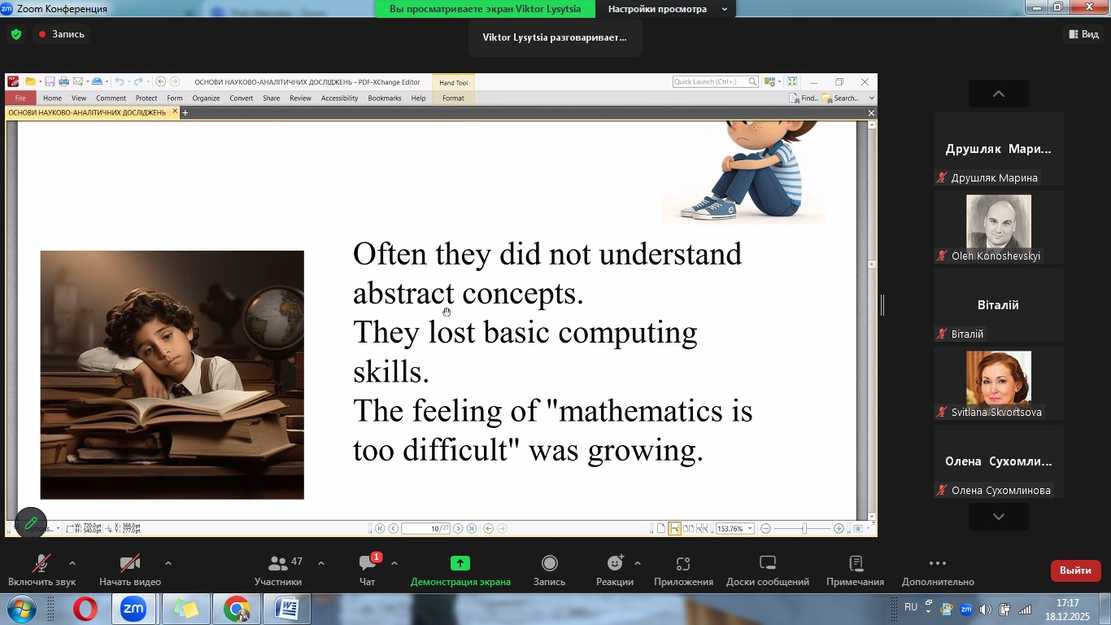 On December 18, 2025, teachers and students of the Department of Higher and Applied Mathematics took part in the next meeting of the scientific seminar of the International Association of Researchers in Mathematics Didactics, which was held in an online format.