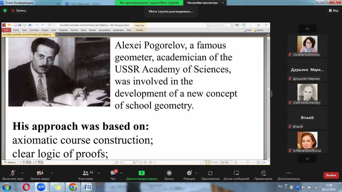 Viktor Tymofiyovych Lysitsa, Candidate of Physical and Mathematical Sciences, Associate Professor of the Department of Higher Mathematics and Informatics of the V.N. Karazin Kharkiv National University, delivered a report on the topic "Alexey Pogorelov and modern methods of teaching mathematics: myth or reality?".