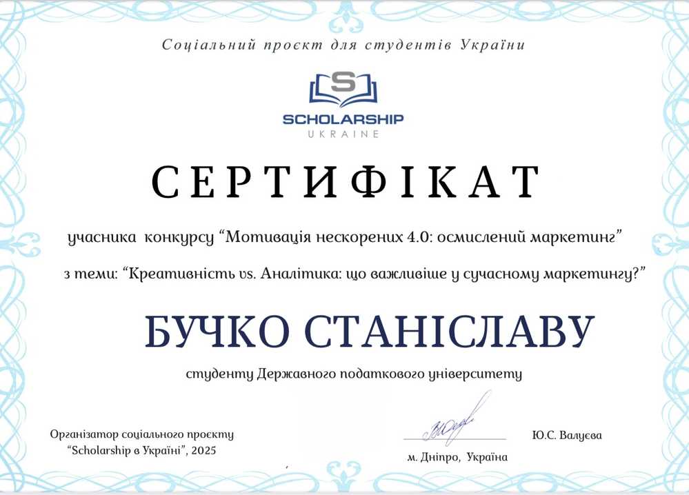 перший заступник голови наукового товариства здобувачів вищої освіти факультету податкової справи, обліку та аудиту |