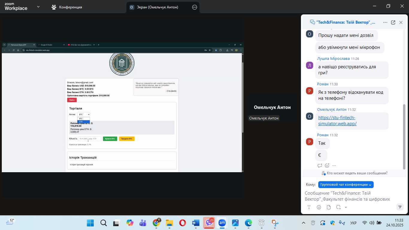 Було презентовано платформу Навчальної біржі ДПУ, де кожен із учасників може перевірити свої трейдерські знання та вміння у купівлі та продажі криптовалюти.