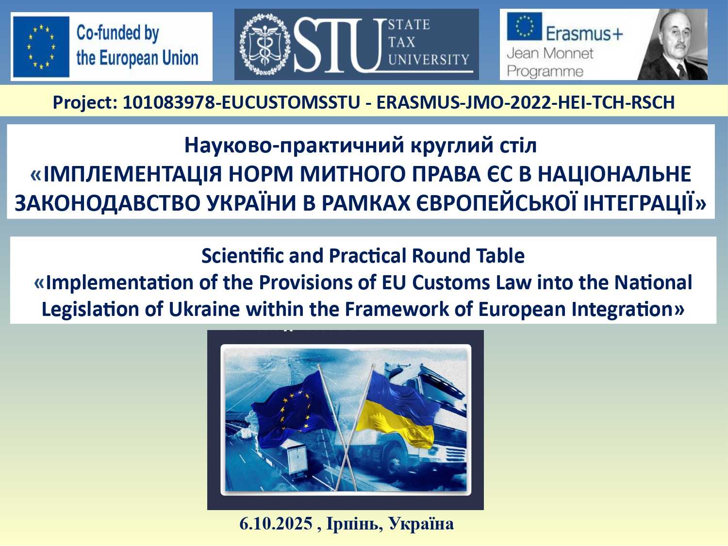 6 жовтня 2025 кафедрою адміністративного права, процесу та митної безпеки було проведено науково-практичний круглий стіл «Імплементація норм митного права ЄС в національне законодавство України». Захід відбувся у змішаному форматі в межах реалізації проєкту програми ЄС Erasmus+ напряму Жана Моне «Митне право ЄС» (101083978-EUCUSTOMSSTU).