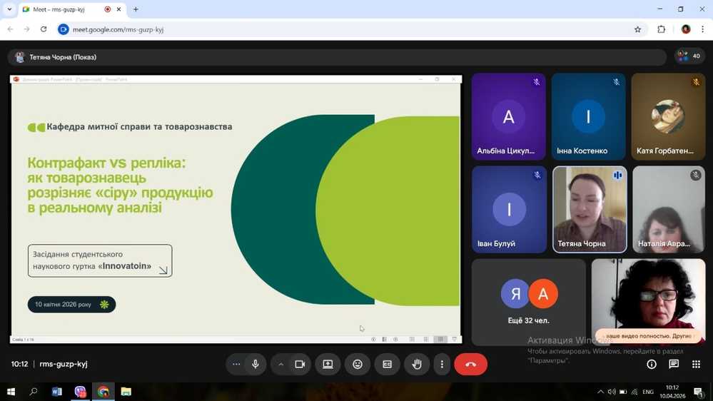 10 квітня 2026 року на кафедрі митної справи та товарознавства відбулося чергове засідання студентського наукового гуртка «Innovation», присвячене актуальній темі: «Контрафакт VS репліка: як товарозна...