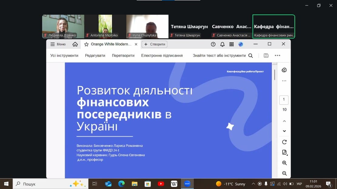 У період з 05 по 11 лютого 2026 року на кафедрі фінансових ринків та технологій відбулися захисти кваліфікаційних робіт здобувачами вищої освіти другого (магістерського) рівня денної та заочної форм навчання за освітніми програмами: «Фінансові технології» (гарант – к-т екон. наук, доцент Наталія Козій) і «Управління фінансовою та страховою діяльністю» (гарант – д-р екон. наук, професор Ірина Чуницька).