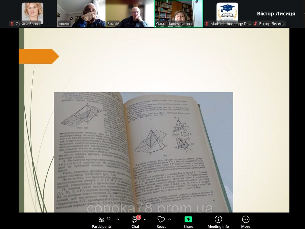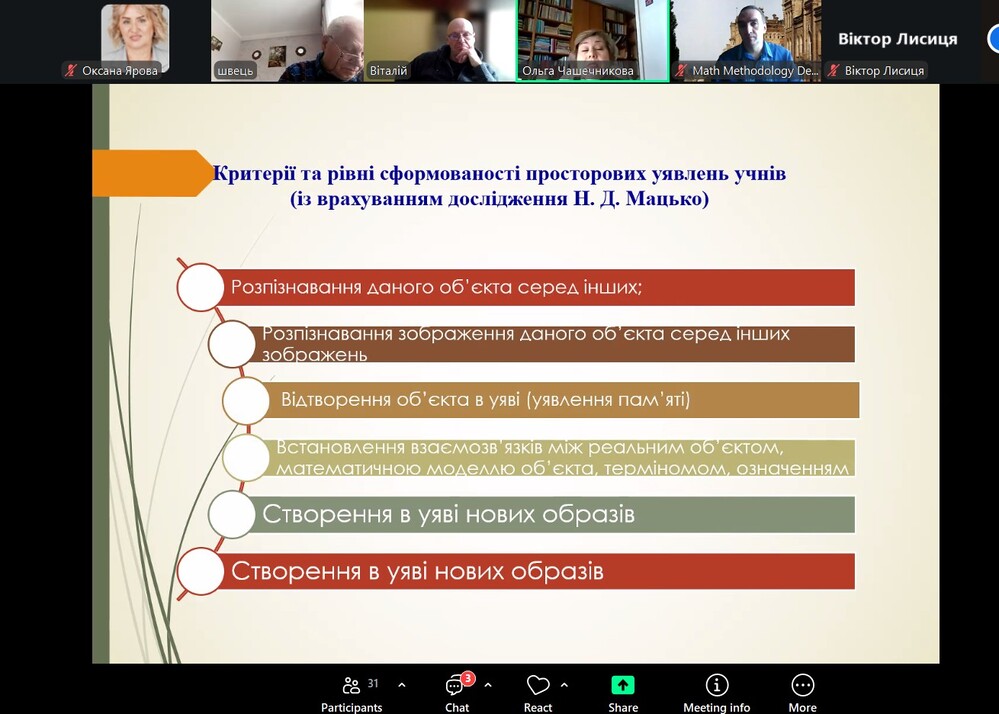 Під час виступу було розглянуто сучасні підходи до формування просторового мислення учнів; роль геометрії та візуалізації в освітньому процесі; вплив цифрових технологій на розвиток математичних компетентностей; методичні стратегії активізації пізнавальної діяльності здобувачів освіти.