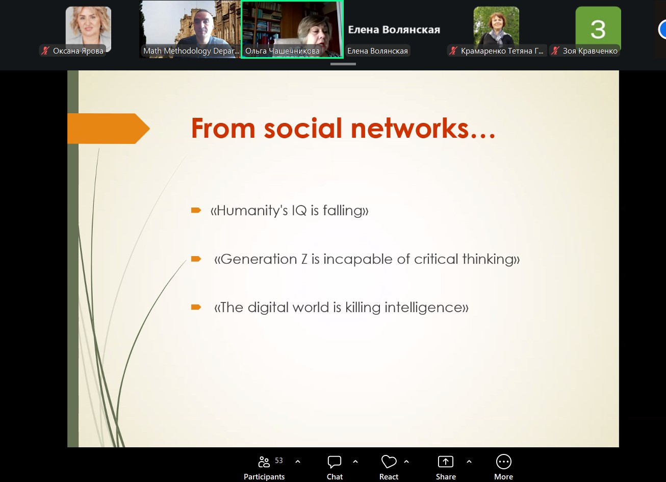 У межах заходу було представлено доповідь на тему «Цифровізація математичної освіти vs розвиток просторового мислення», яку підготували провідні науковиці: Чашечникова Ольга Серафимівна, доктор педагогічних наук, професор, завідувачка кафедри математики, фізики та методик їх навчання, та Одінцова Оксана Олександрівна, кандидат фізико-математичних наук, доцент Сумського державного педагогічного університету імені А.С. Макаренка.