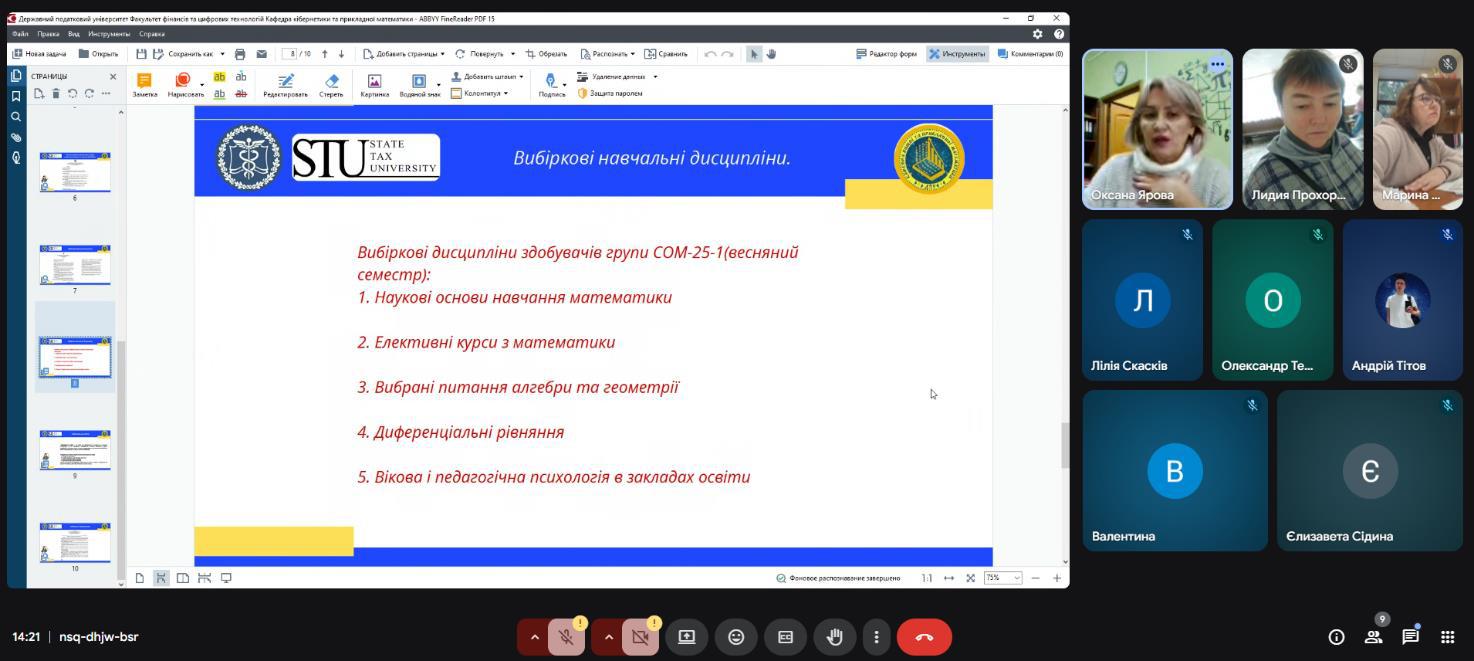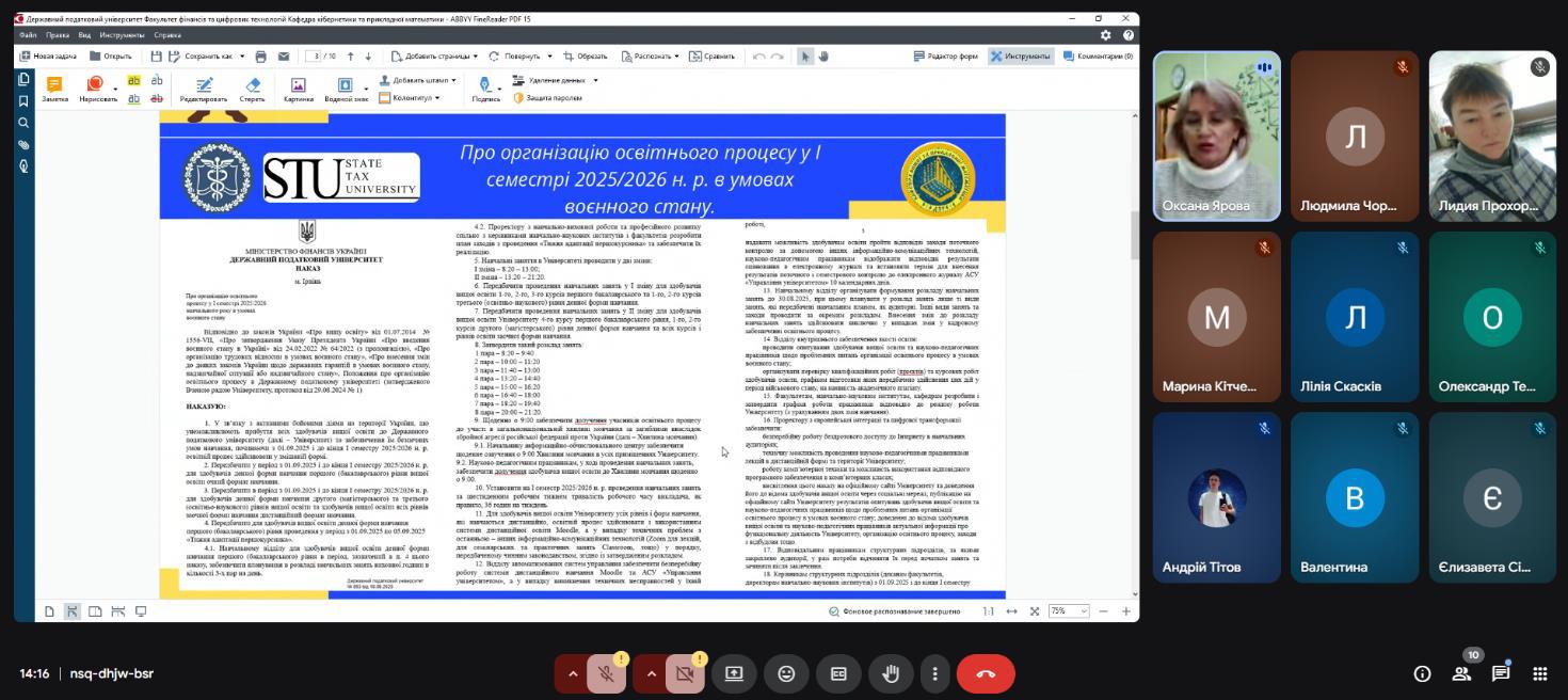 8 жовтня 2025 року відбулася онлайн-зустріч здобувачів вищої освіти другого (магістерського) рівня вищої освіти ОП «Середня освіта: математика» факультету фінансів та цифрових технологій Державного податкового університету з гарантом освітньої програми доктором фізико-математичних наук, професором, професором кафедри вищої та прикладної математики Семком М. М., а також науково-педагогічними працівниками в рамках інформаційно-організаційної роботи на початку нового навчального семестру.