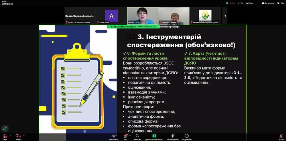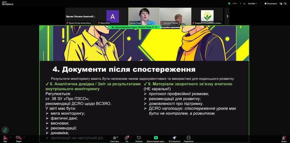 Учасники ознайомилися з нормативно-правовими засадами внутрішнього контролю, сучасними моделями спостереження (коучинговою, партнерською, розвитковою), етапами підготовки та проведення відвідування уроку, а також отримали практичні інструменти - шаблони, чеклісти й орієнтовні запитання для професійної бесіди.