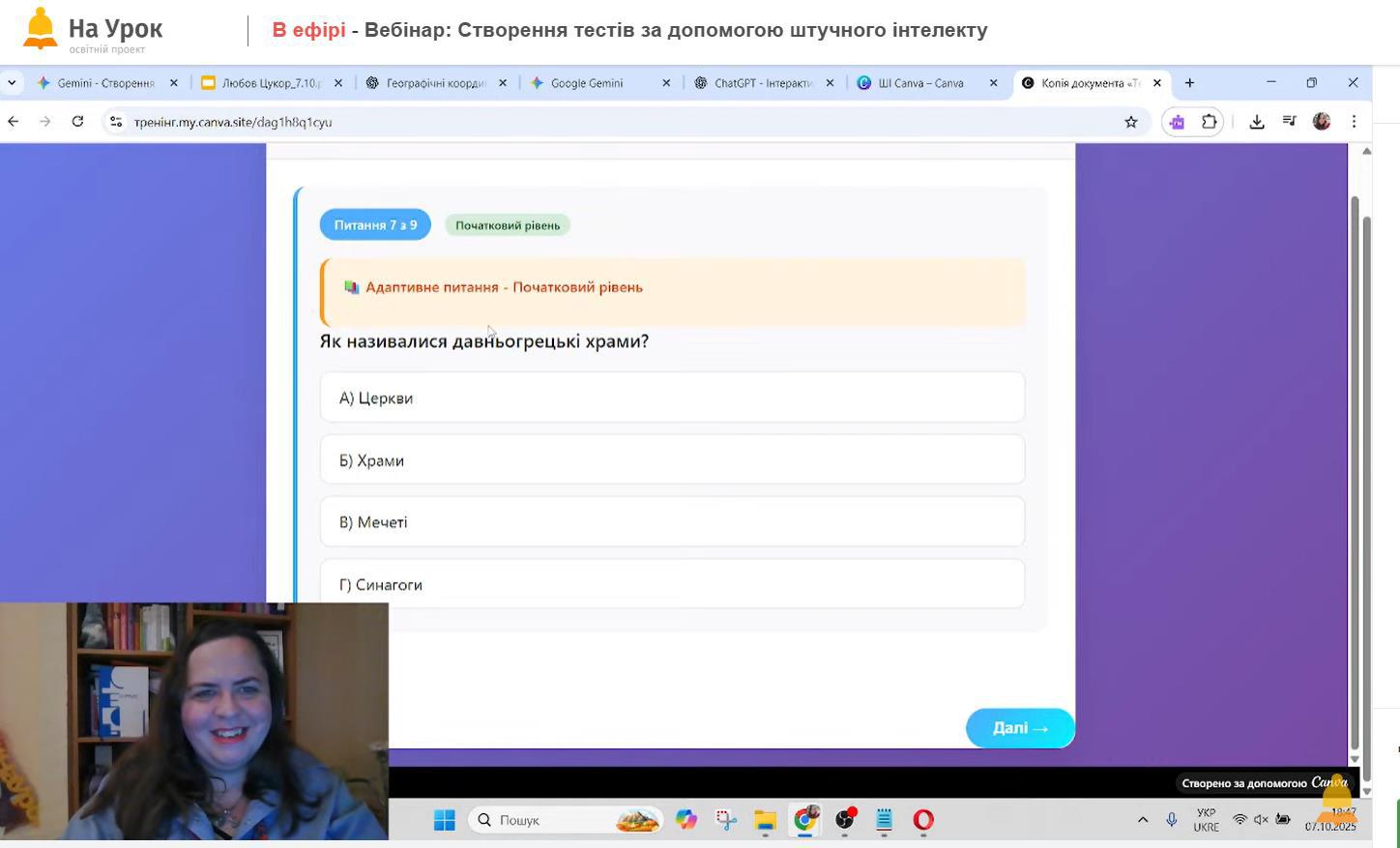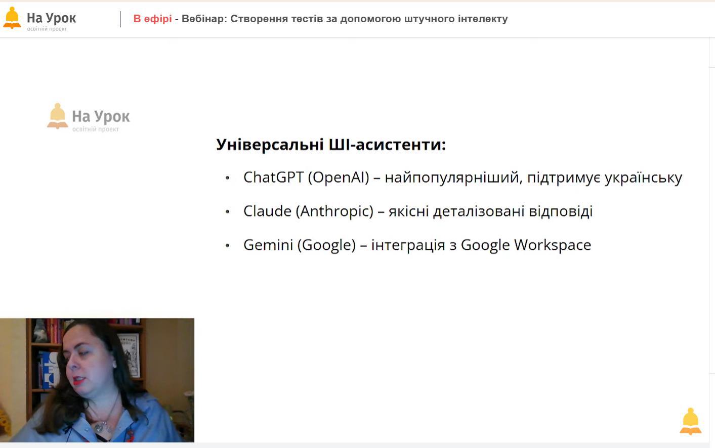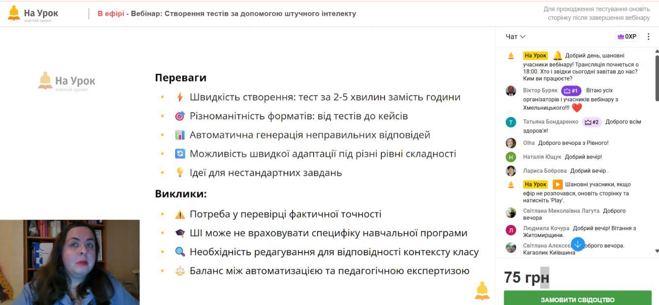Учасники вебінару дізналися, як ефективно працювати з популярними інструментами штучного інтелекту для створення тестів різних форматів, розглянули приклади адаптації завдань до потреб учнівського колективу та проаналізували можливості інтеграції ШІ у щоденну педагогічну практику.