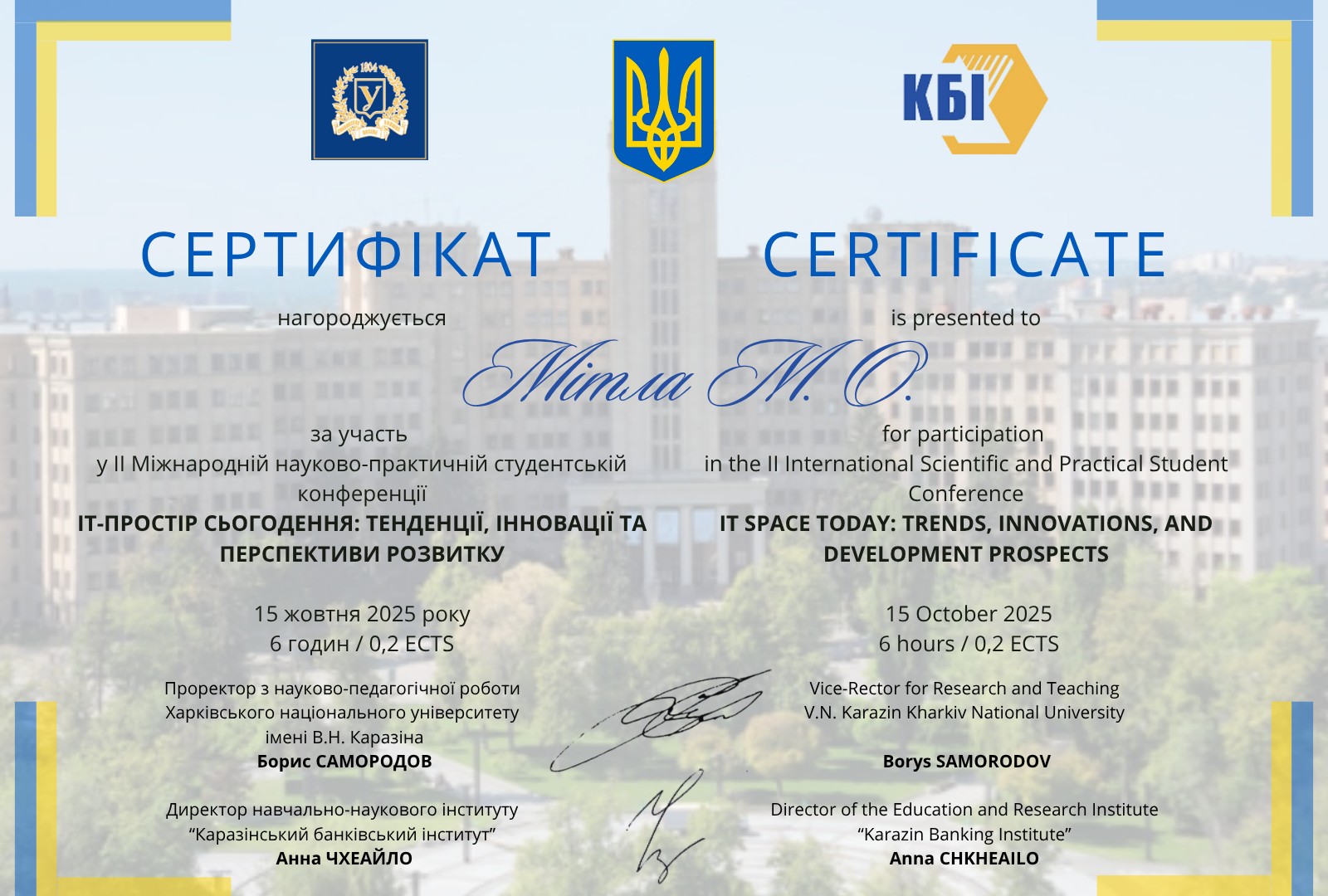 15 жовтня 2025 року здобувачки вищої освіти групи ЦДБ-23-1 Коваленко Каріна та Мітла Марія взяли участь у ІІ Міжнародній науково-практичній студентській конференції «ІТ-простір сьогодення: тенденції, інновації та перспективи розвитку», організованій кафедрою інформаційних технологій та математичного моделювання Навчально-наукового інституту «Каразінський банківський інститут» Харківського національного університету імені В. Н. Каразіна.