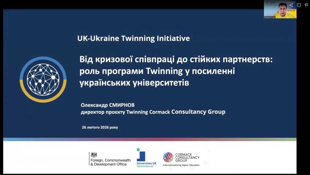 - Олександр Смірнов, директор проєкту Ukraine Twinning, розповів про можливості участі українських університетів у даному проекті, що фінансується Cormack Consultancy Group (Велика Британія). https://www.consultcormack.com/