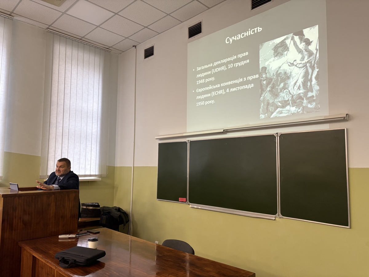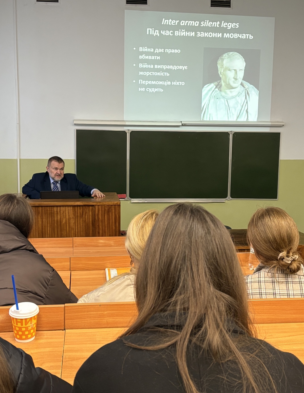 Особливу увагу було приділено принципам міжнародного гуманітарного права, а також сучасним викликам у сфері його реалізації в умовах збройної агресії проти України. Студенти виявили значний інтерес до теми, активно ставили запитання та отримали вичерпні й професійні відповіді від лектора, що сприяло поглибленню їх правової культури та розуміння міжнародних стандартів правосуддя.