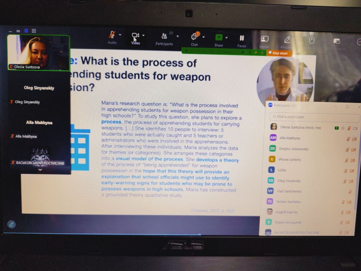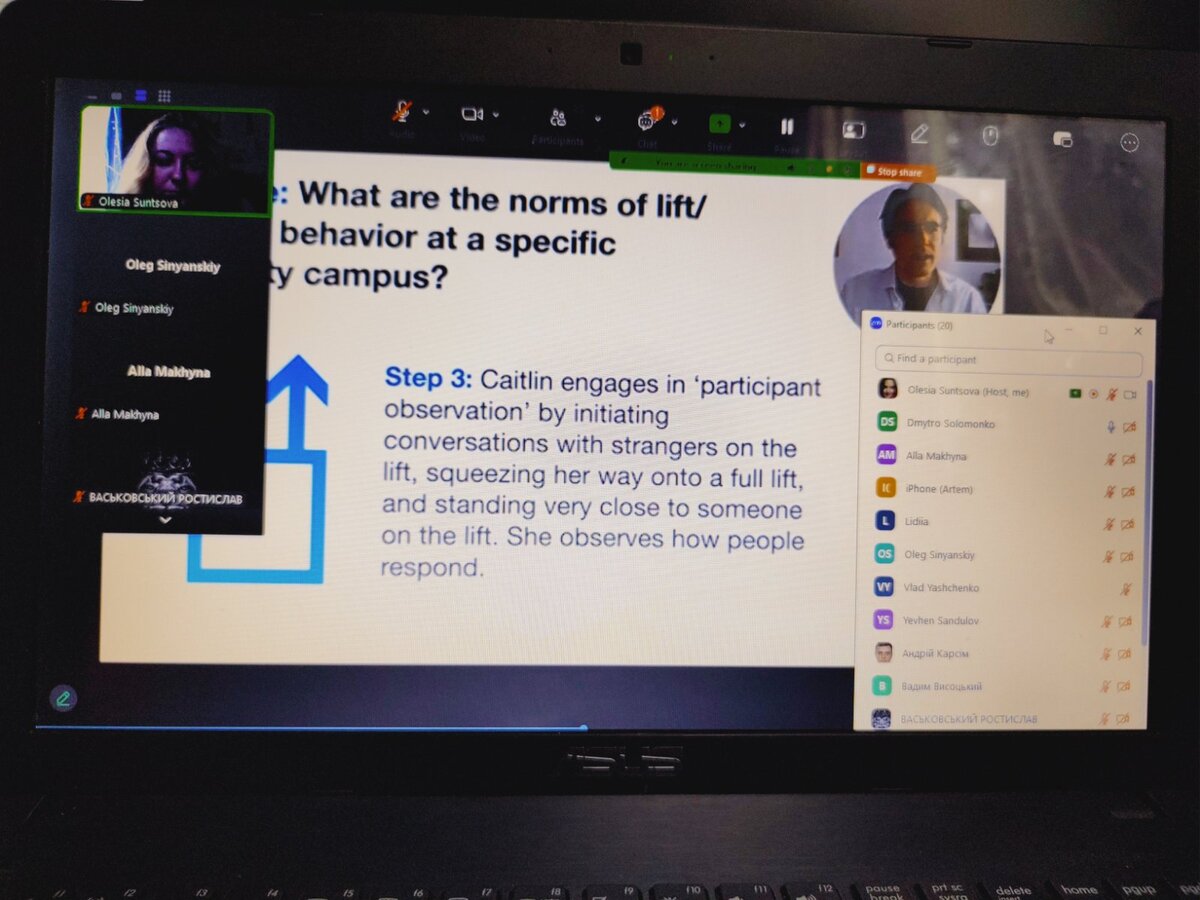 У своїй доповіді лектор зосередив увагу на ключових елементах проведення якісного наукового дослідження різноманітними методами та прийомами, які є звичними для науковців в США. У цій лекції Джонатан Ціско розглянув основні елементи якісних методів, що використовуються в дослідженнях у США, а також дослідницькі парадигми, які ґрунтують свою роботу на якісних методах. Також на лекції разом із здобувачами освіти Джонатоном було обговорено якісні дизайни та розглянуто приклади дослідницьких питань, які самі по собі підходять для якісного аналізу.