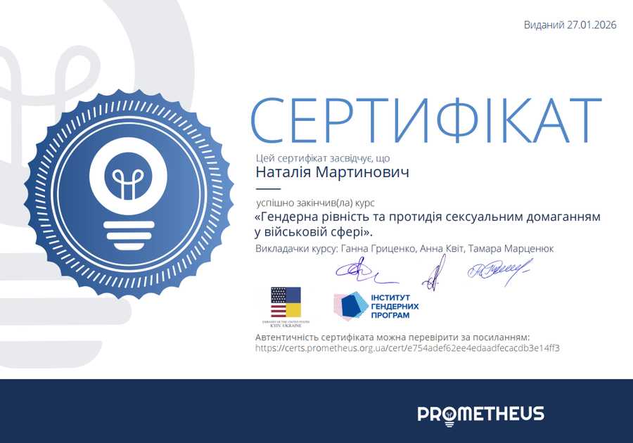 За результатами проходження онлайн-курсів кожен учасник отримав сертифікат та набув практичних знань й компетентностей, необхідних для впровадження принципів рівних прав й можливостей жінок і чоловіків, формування недискримінаційного освітнього середовища та протидії проявам насильства за ознакою статі.
