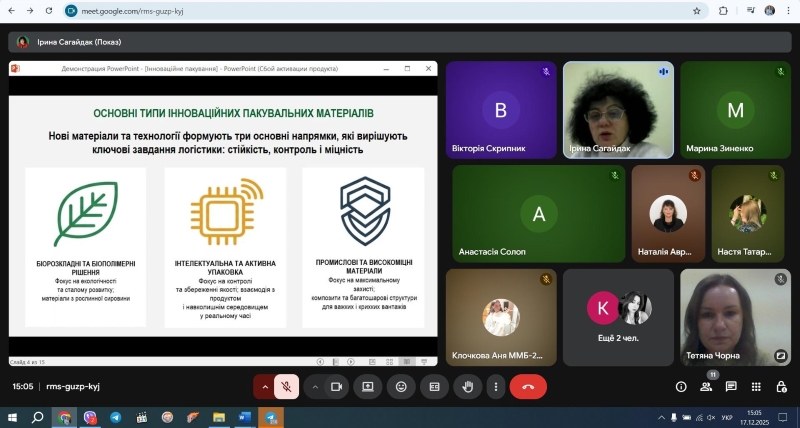17 грудня 2025 року на кафедрі митної справи та товарознавства відбулося чергове засідання студентського наукового гуртка «Innovation». Темою зустрічі стала актуальна проблематика: «Інноваційні пакувальні матеріали: вплив на якість та безпечність товарів під час міжнародного транспортування».