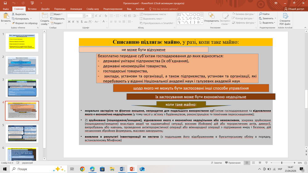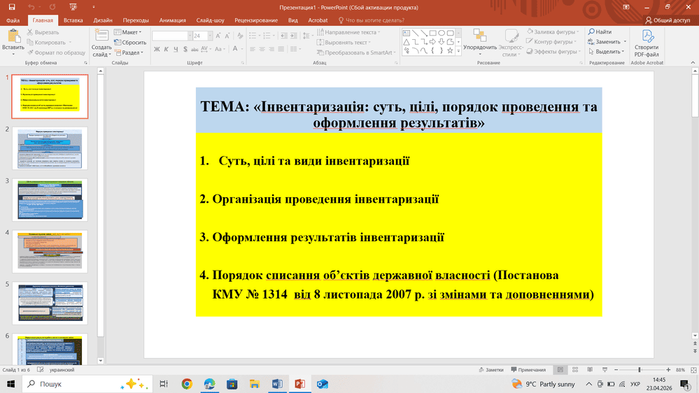 У ході виступу було висвітлено теоретико-методичні засади порядку проведення інвентаризації як важливого елементу системи обліку та контролю. Особливу увагу приділено призначенню, нормативно-правовому регулюванню інвентаризаційних процедур та етапам проведення. Розглянуто порядок документального оформлення результатів інвентаризації, відображення її результатів у бухгалтерському обліку та звітності, а також типові помилки, що виникають під час її проведення. Висвітлено порядок списання об’єктів державної власності за результатами інвентаризації: нормативне регулювання списання, обстеження, демонтажу; порядок прийняття рішення про списання, механізм та особливості списання майна та документальне оформлення результатів роботи комісії зі списання.