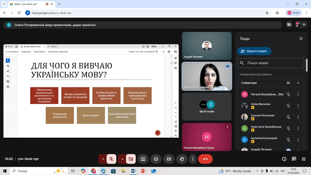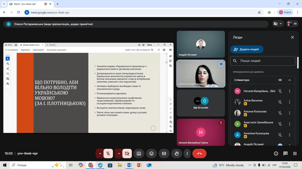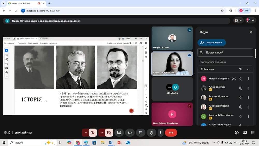 1 квітня 2026 року кафедрою обліку та аудиту була організована гостьова лекція за участю провідної фахівчині у сфері документального забезпечення — Олеся Потаржевська, завідувача сектору літературного редагування Управління документального забезпечення Пенсійний фонд України.