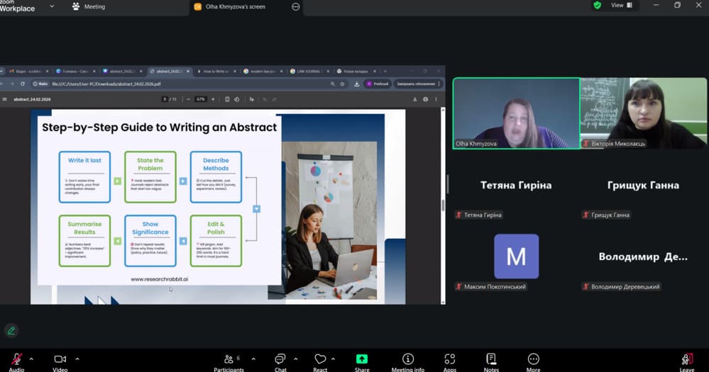 Спікером заходу стала Ольга Хмизова, кандидат педагогічних наук, доцент кафедри правничої лінгвістики, яка представила презентацію на тему: "How to Write an Abstract for a Research Paper" («Як написати анотацію до наукової статті»).