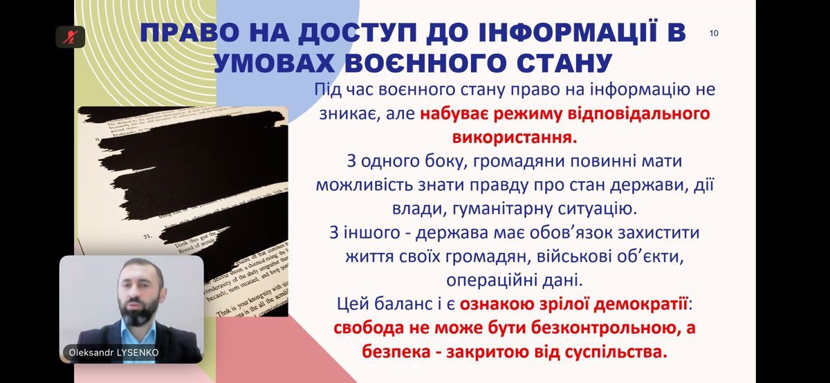 Під час лекції Олександр Миколайович висвітлив актуальні питання реалізації права на доступ до інформації в умовах воєнного стану, правові обмеження, передбачені чинним законодавством, та практичні аспекти захисту інформаційних прав громадян. Студенти активно долучалися до обговорення, ставили запитання та дискутували щодо ролі відкритості інформації у демократичному суспільстві.