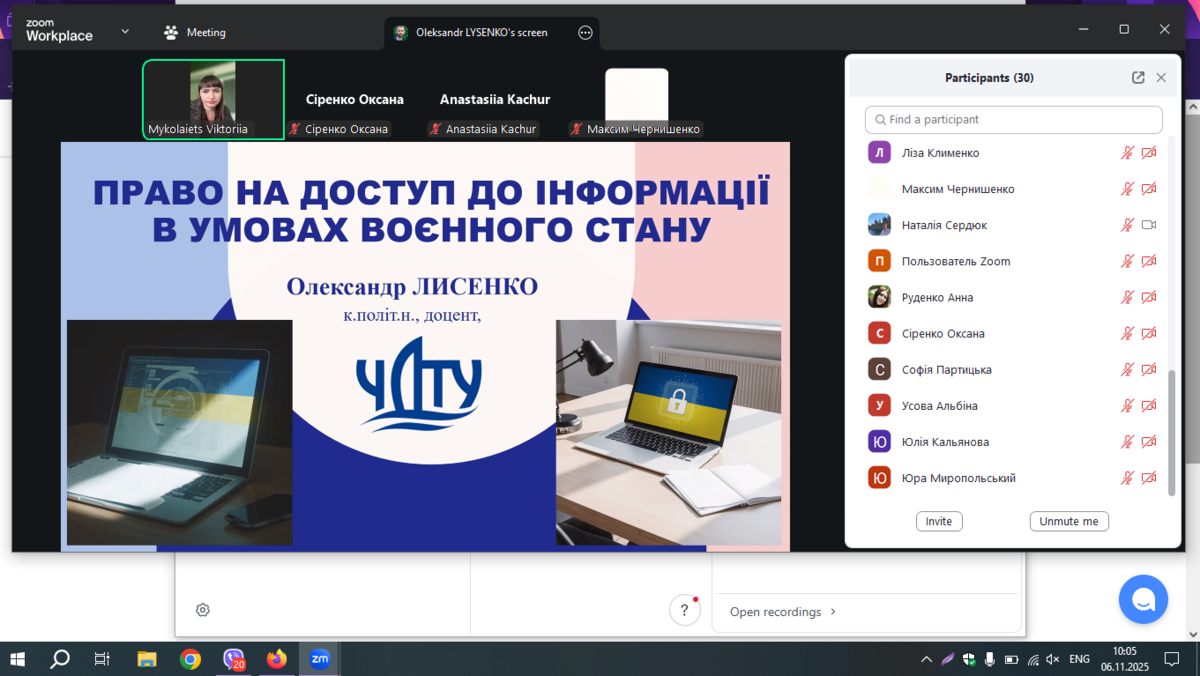 06 листопада 2025 року кафедрою теорії та історії держави і права організувано гостьову лекцію для здобувачів вищої освіти Навчально-наукового інституту права на тему: «Право на доступ до інформації в умовах воєнного стану».