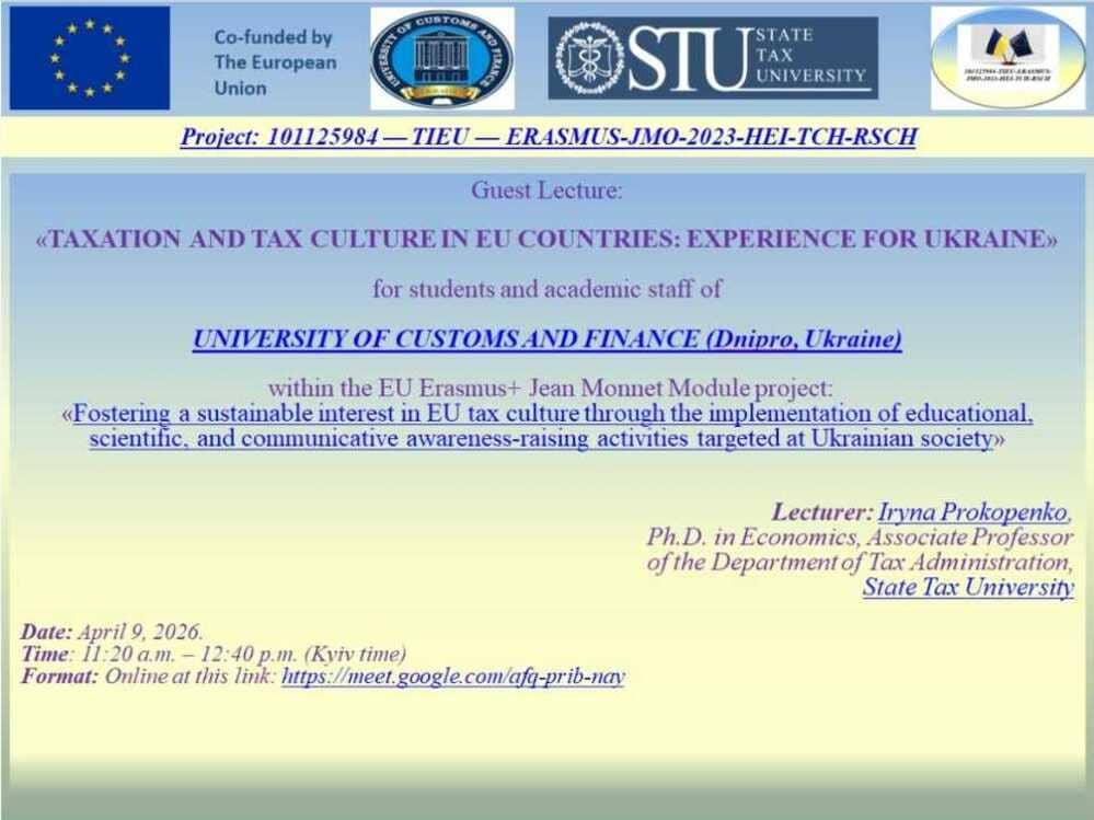 On April 9, 2026, a guest lecture titled “Taxation and Tax Culture in EU Countries: Lessons for Ukraine” was successfully delivered for students and academic staff of the University of Customs and Fin...