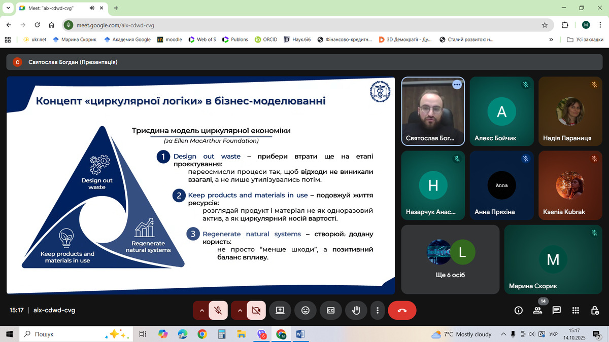 Під час виступу лектор запропонував слухачам глибокий погляд на сучасну еволюцію бізнес-моделей — від лінійної логіки input–output–waste до циркулярної input–use–reuse–value, що трансформує уявлення про ефективність, прибутковість та сталість бізнесу.