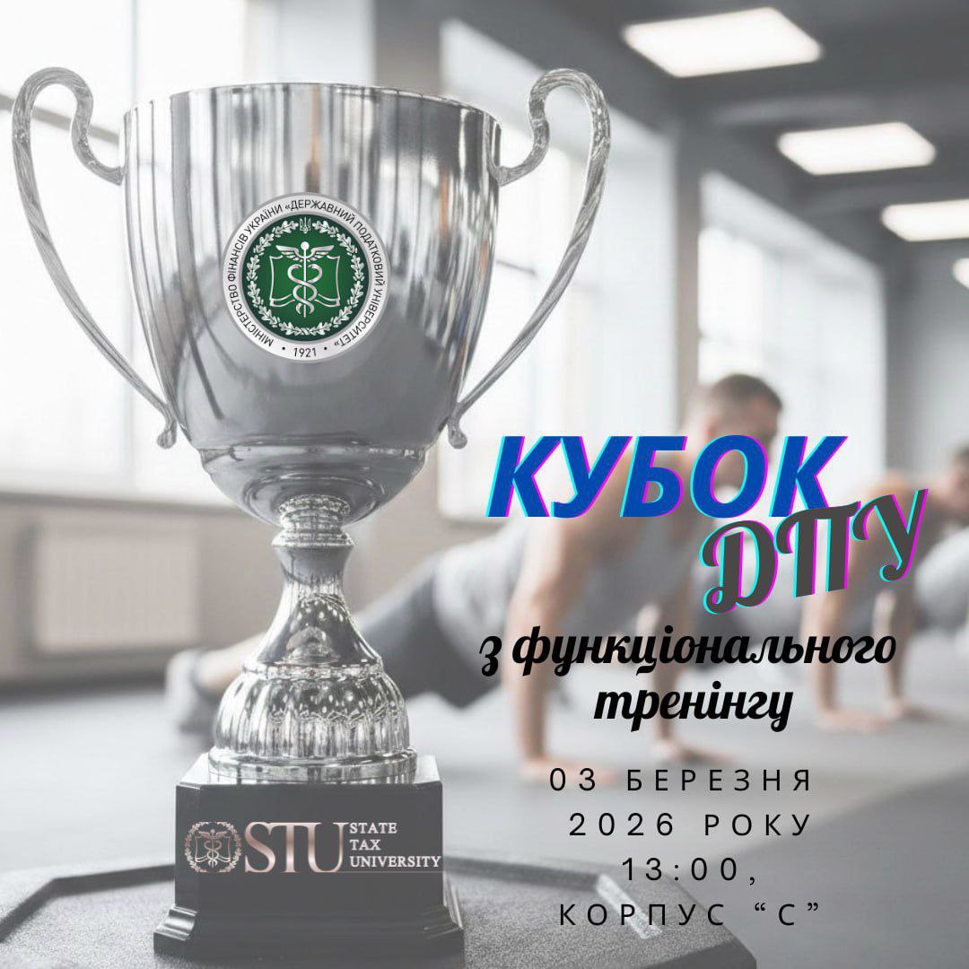 Державний податковий університет запрошує збірні команди навчально-наукових інститутів та факультативів до участі у Кубку з функціонального тренінгу, який відбудеться 3 березня о 13:00 у корпусі «С», Державний податковий університет.