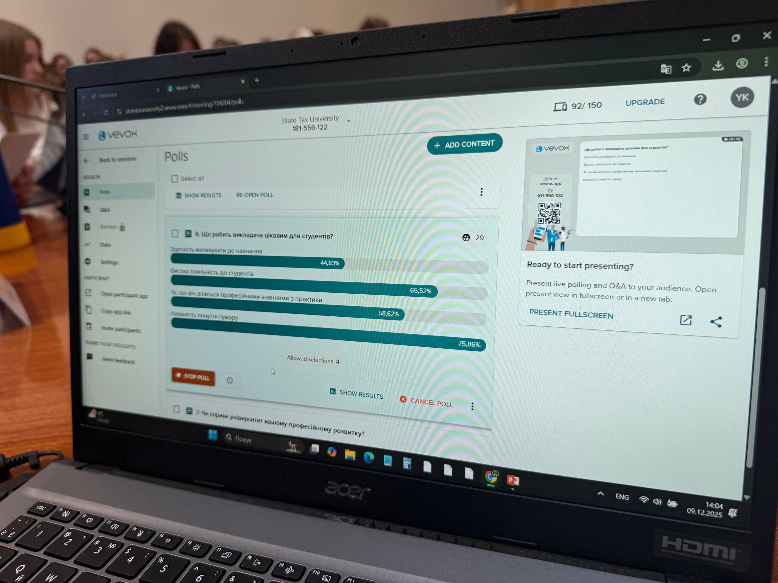 Початок зустрічі перетворився на інтерактив: студенти відсканували QR-код і пройшли опитування просто під час події. Система одразу показувала результати на екрані, і очільник вишу разом зі студентами обговорював відповіді.