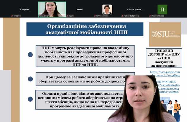Модератором та основним спікером заходу виступила Ганна Грищук – завідувач навчально-методичного відділу, яка розкрила ключові аспекти академічної мобільності, прокоментувала нормативне забезпечення та практичні можливості для здобувачів вищої освіти та науково-педагогічних працівників у частині розширення освітньої і наукової співпраці.