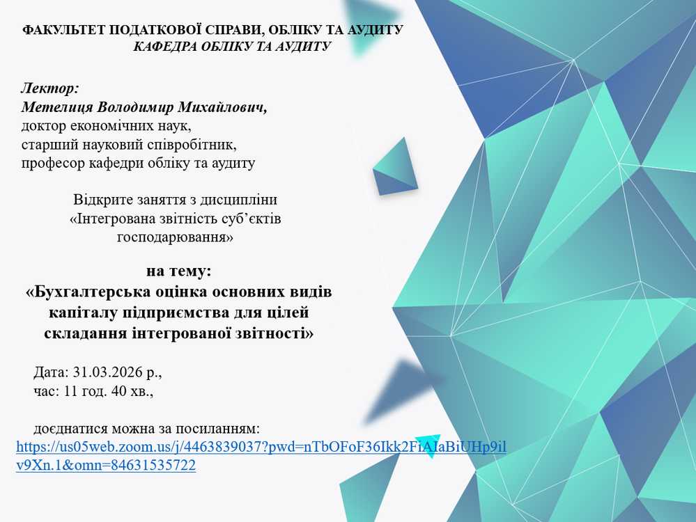 31.03.2026 р. об 11:40 (3 пара) в групі АО-25-1 відбудеться відкрита лекція доктора економічних наук, старшого наукового співробітника, професора кафедри обліку та аудиту Метелиці Володимира Михайлови...