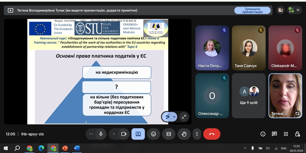 28.03.2026 року в Державному податковому Університеті завершено заняття з факультативного курсу: «Оподаткування та спільна податкова політика ЄС» на другому році виконання Проєкту ЄС Еразмус+ «Формування стійкого інтересу до податкової культури ЄС шляхом запровадження освітніх, наукових та комунікативних просвітницьких заходів, орієнтованих на українське суспільство» 101125984 – TIEU – ERASMUS-JMO-2023-HEI-TCH-RSCH (Грантова Угода № 101125984 -TIEU).