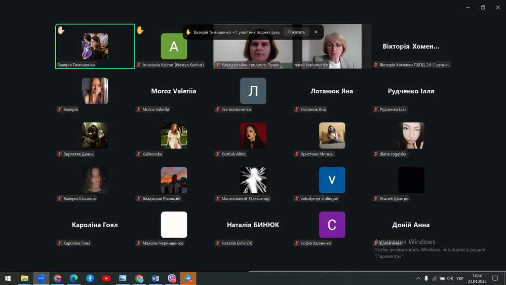 22 квітня 2026 р. кафедрою міжнародного права та права Європейського Союзу була організована гостьова онлайн–лекція, яку провела докторка юридичних наук, доцентка, доцентка кафедри теорії держави і права, конституційного права та державного управління Дніпровського національного університету імені Олеся Гончара Капітаненко Наталія Петрівна, провідний фахівець з інформаційного права.