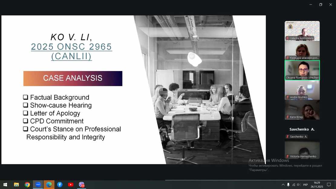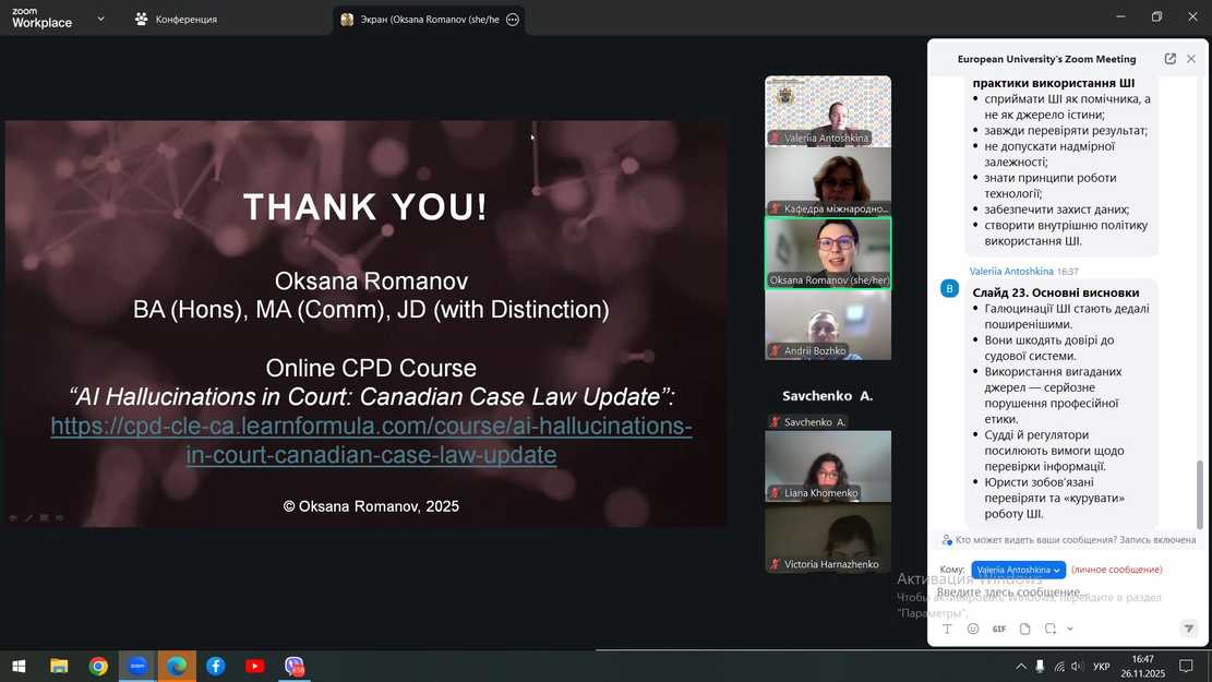 26 листопада 2025 року здобувачі спецальності Міжнародне право відвідали гостьову лекцію відомої канадської адвокатки та колишньої урядової прокурорки провінції Онтаріо Оксани Романов. Тема лекції — «ШІ-галюцинації в юридичному контексті: сучасні тенденції Канади».