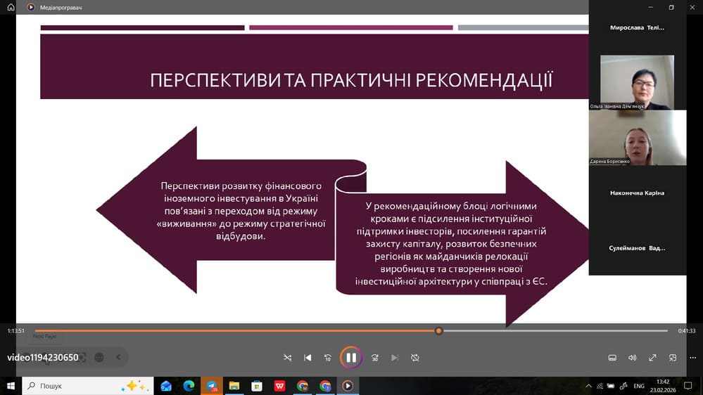 4 лютого 2026 року в Державному податковому університеті відбувся захист кваліфікаційних робіт здобувачів вищої освіти другого (магістерського) рівня вищої освіти, денної форми навчання групи МЕМз-24-1, що навчалися за освітньо-професійною програмою «Міжнародна економіка». Захист пройшов у відкритому форматі та засвідчив високий рівень фахової підготовки здобувачів вищої освіти. Головою екзаменаційної комісії призначено Дем’янчук Ольга Іванівна, д.е.н., професор, професор кафедри фінансів та бізнесу, директор Навчально-наукового інституту міжнародних відносин та національної безпеки Національного університету «Острозька академія».