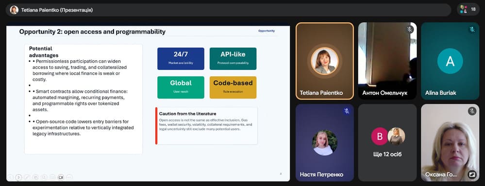 У змісті лекції було розкрито сутність та перспективи розвитку децентралізованих фінансів (DeFi), окреслено ключові виклики для глобальної фінансової системи, а також наведено приклади практичного застосування технологій у сучасному світі. Високий професіоналізм лекторки, її глибокий аналіз та вміння доступно пояснювати складні концепції викликали щиру зацікавленість слухачів.