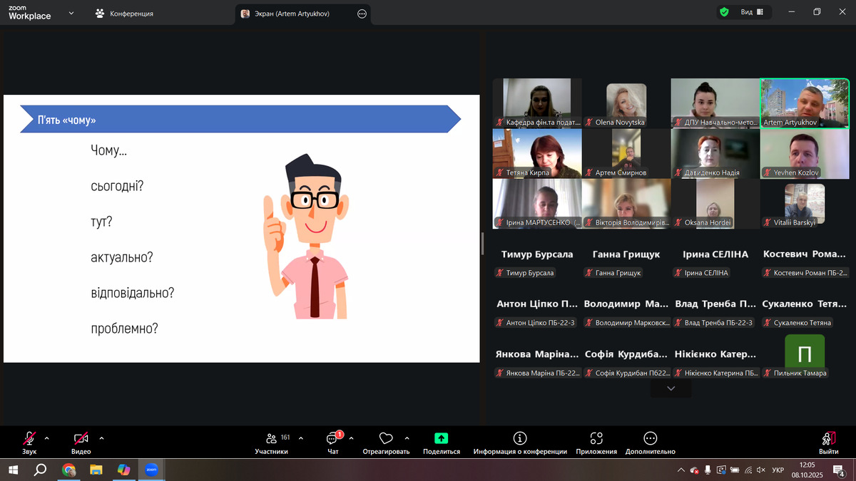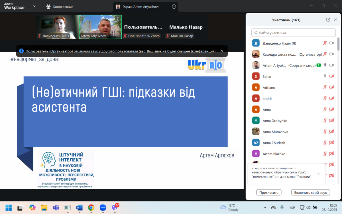 8 жовтня 2025 року колектив кафедри публічних фінансів, а також здобувачі вищої освіти першого (бакалаврського), другого (магістерського) та третього (освітньо-наукового) рівнів спеціальності D2 «Фінанси, банківська справа, страхування та фондовий ринок» взяли активну участь в онлайн-вебінарі на тему «(Не) етичний ГШІ: підказки від асистента».