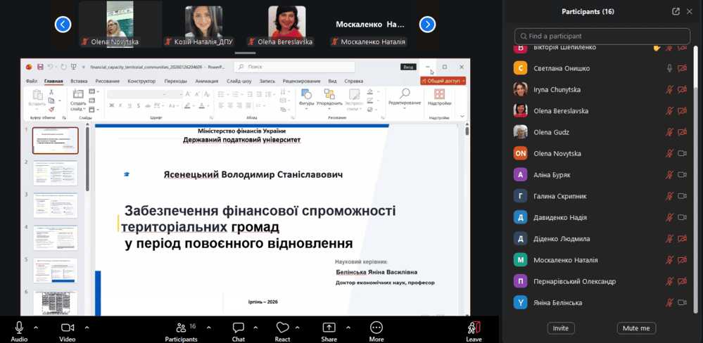 До обговорення долучилися науково-педагогічні працівники двох кафедр: публічних фінансів і фінансових ринків та технологій, що забезпечило міждисциплінарний підхід до аналізу представлених досліджень. Такий формат сприяв розширенню наукової дискусії, поєднанню різних методологічних підходів та формуванню комплексного бачення актуальних проблем фінансової науки.