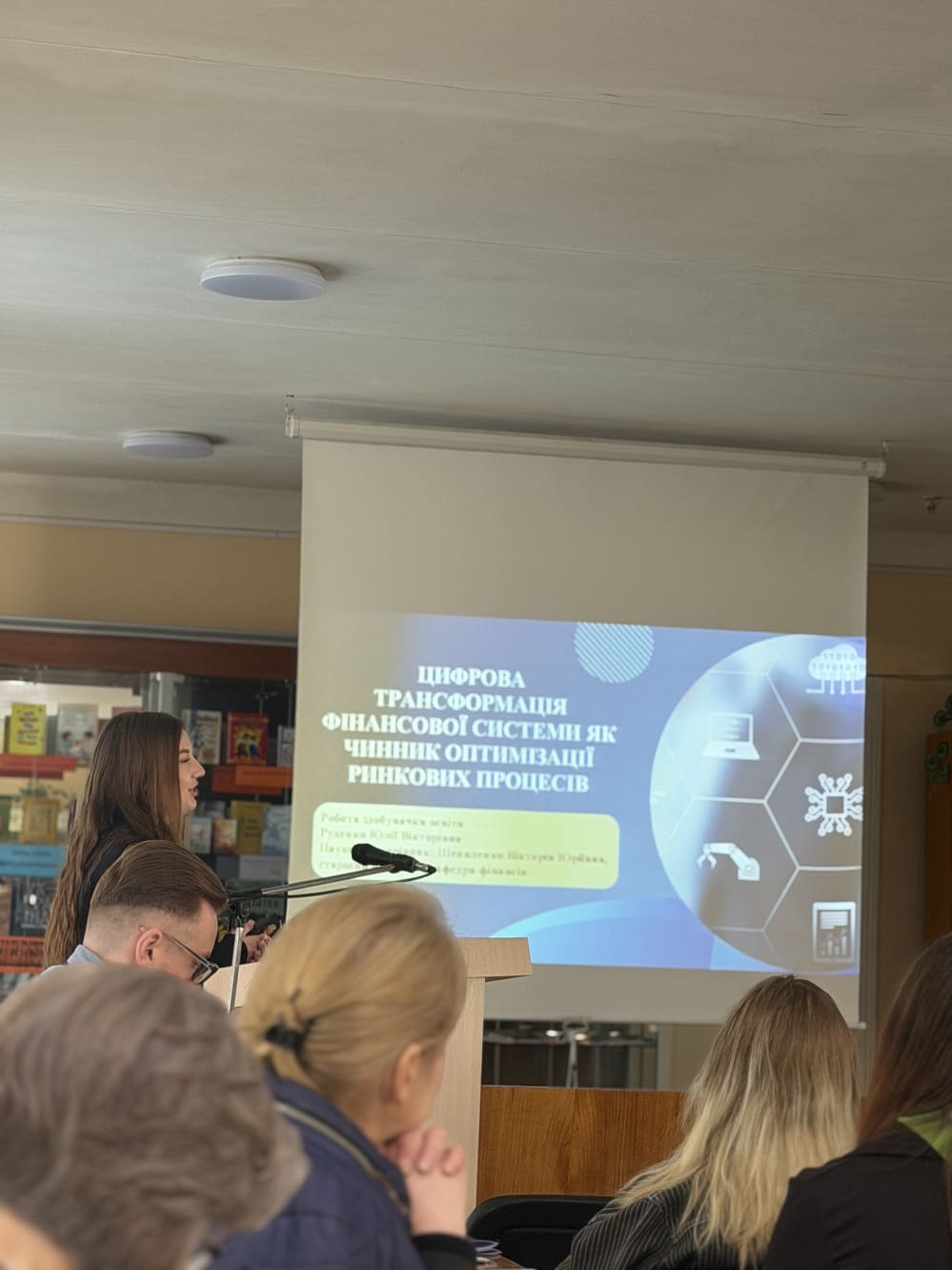 Юлія Руденко представила доповідь на тему «Цифрова трансформація фінансової системи як чинник оптимізації ринкових процесів». Розкрила ключові аспекти впливу цифровізації на сучасну фінансову систему, зокрема автоматизацію фінансових операцій, впровадження інноваційних технологій у банківському секторі та підвищення ефективності ринкових механізмів. Окрему увагу було приділено ролі цифрових інструментів у забезпеченні прозорості фінансових потоків та оптимізації управлінських рішень. Виступ супроводжувався жвавою науковою дискусією, у ході якої учасники обговорили перспективи подальшого розвитку цифрової економіки та її вплив на стабільність і конкурентоспроможність фінансового ринку України.
