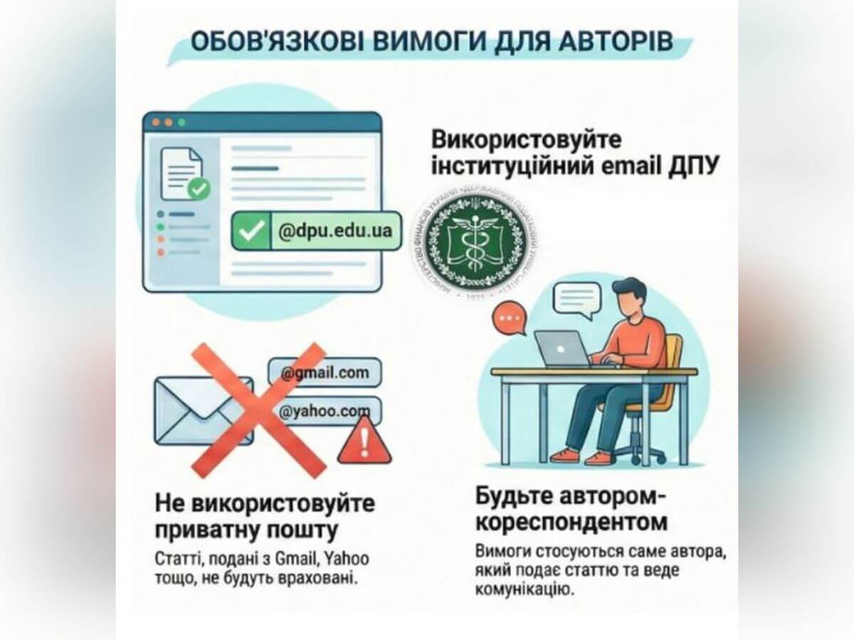 - Корпоративна пошта: Під час подання рукопису автор-кореспондент обов’язково має використовувати електронну пошту в домені Державного податкового університету.