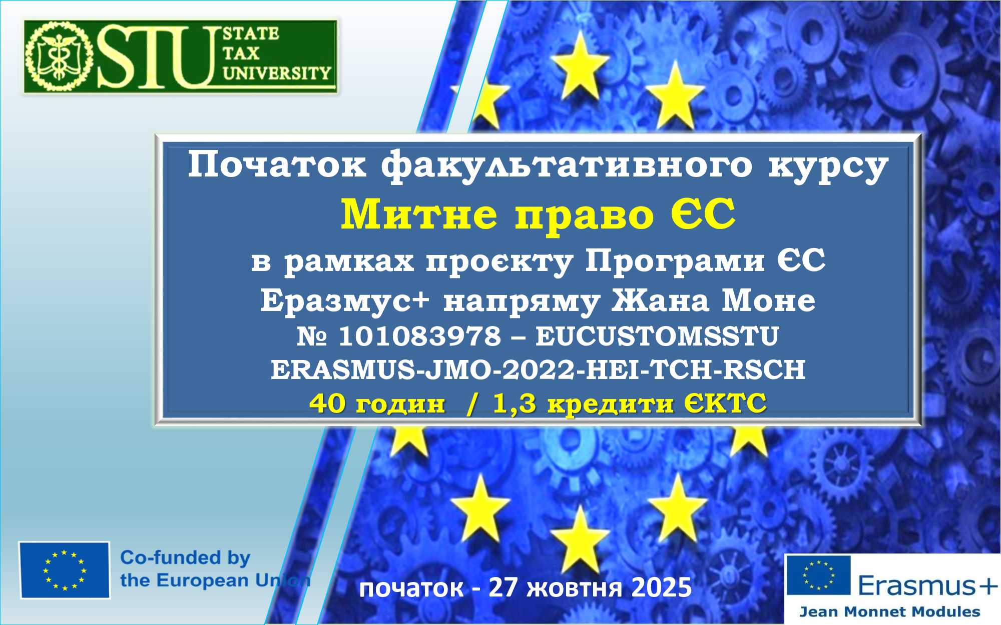 Запрошуємо здобувачів вищої освіти першого (бакалаврського) рівня вищої освіти спеціальності D8 «Право» ОПП «Митна безпека», а також всіх зацікавлених долучитися до факультативного курсу з «Митного права ЄС» в рамках проєкту ЄС Еразмус+ напряму Жан Моне (2022-2025).