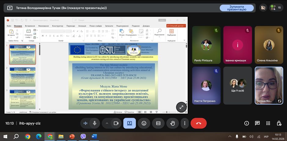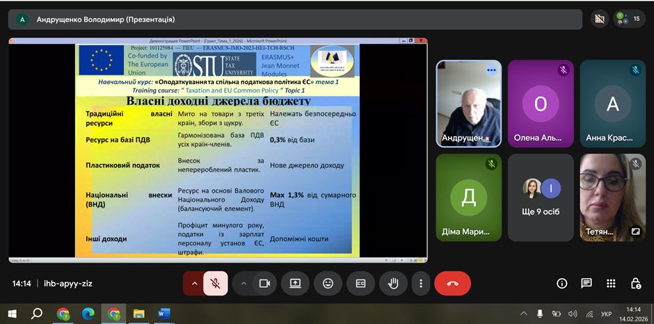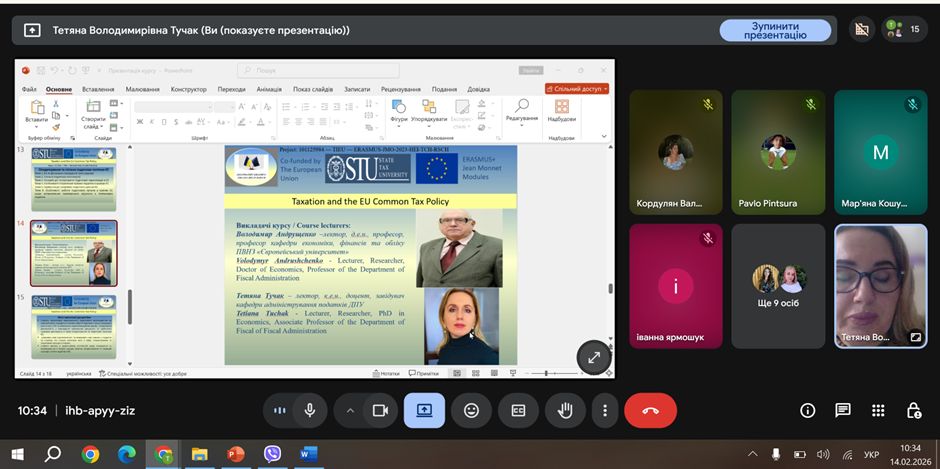14.02.2026 року в Державному податковому Університеті розпочато факультативний курс третього року виконання: «Оподаткування та спільна податкова політика ЄС» в рамках здійснення Модуля Жана Моне «Формування стійкого інтересу до податкової культури ЄС шляхом запровадження освітніх, наукових та комунікативних просвітницьких заходів, орієнтованих на українське суспільство» (Грантова Угода № 101125984 – TIEU).