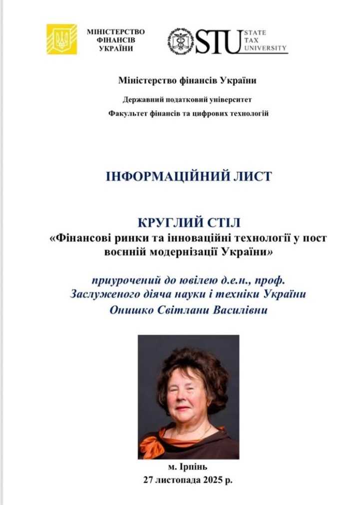 У Державному податковому університеті відбувся круглий стіл «Фінансові ринки та інноваційні технології у поствоєнній модернізації України» до ювілею видатної вченої, педагогині та наставниці - доктора економічних наук, професора, заслуженого діяча науки і техніки України Світлани Василівни Онишко.